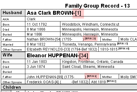 The individual record ID numbers (RINs) are the numbers next to the names of the parents of this family. Next, look at Asa's parents. The number next to Nathan Brown's name, is his RIN, and the MRIN number for Asa's parents' is MRIN 29. This illustrates how the Legacy system cross-references itself. If you were currently looking at Asa's family group record and his documents, and you now want to find the documents associated with Asa's parents,vjust look at the MRIN number next to the father [54].